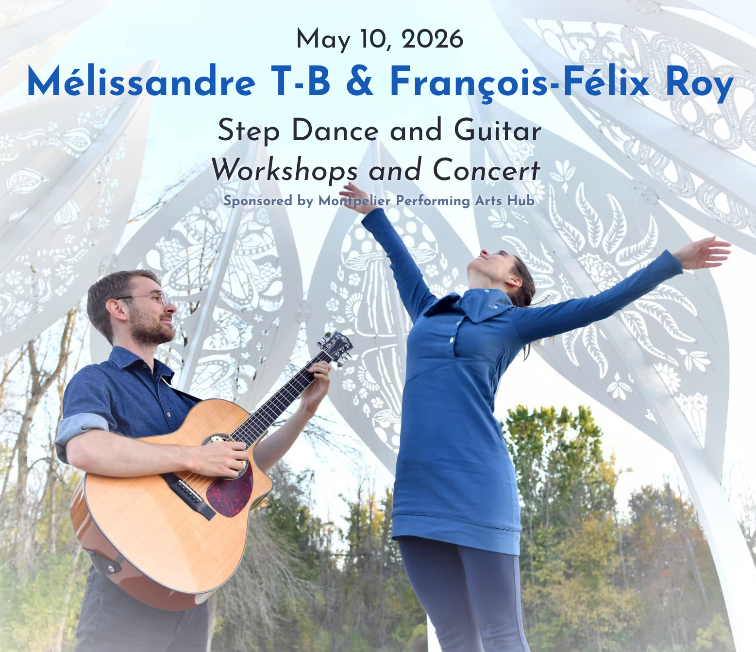 In this duo, delicacy and power find each other. François-Félix Roy draws from Québécois traditional tunes, Scandinavian melodies, archival songs, and mouth music to build a rich, layered guitar repertoire. Mélissandre T-B responds in movement — her distinctive language weaving Québec step dance, ballet, and contemporary forms into something spontaneous and precise at once. By turns playful, dramatic, and virtuosic, their performance is a conversation between two artists who share a deep reverence for tradition and a restless creative curiosity. The result is a finely crafted encounter where music and dance don't merely coexist — they listen to each other.