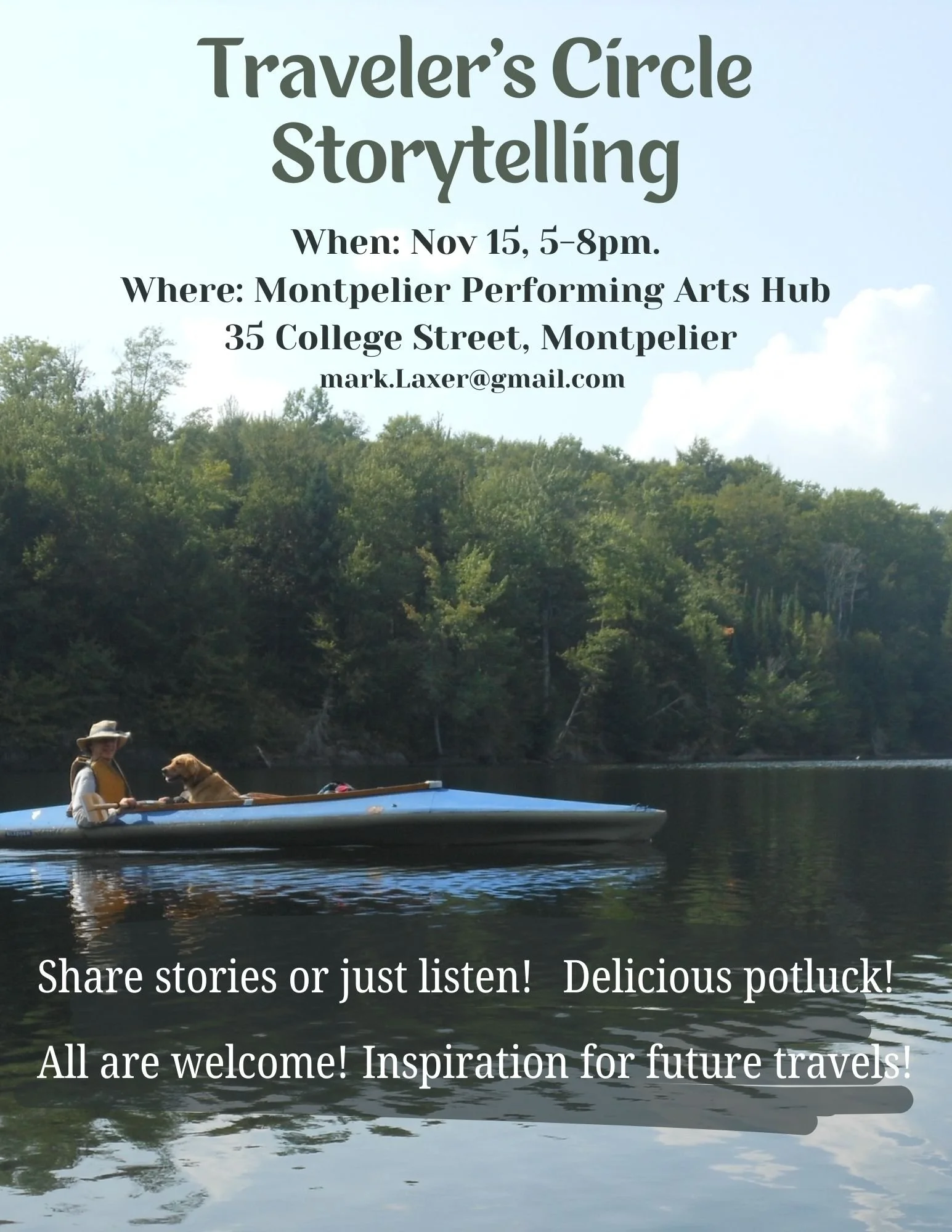 Travel storytelling at the Montpelier Performing Arts Hub! All welcome! Share a story or just listen! Possible themes: Encounters with large cats, best and worst food stories, and incredibly dangerous places....